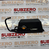 Boost Logic aluminum coolant overflow tank. It is designed to replace the OEM plastic reservoir with a more robust and visually appealing component. The tank is constructed from lightweight aluminum and is compatible with various vehicle applications. This part is ideal for a clean engine bay aesthetic and is known for its durability.