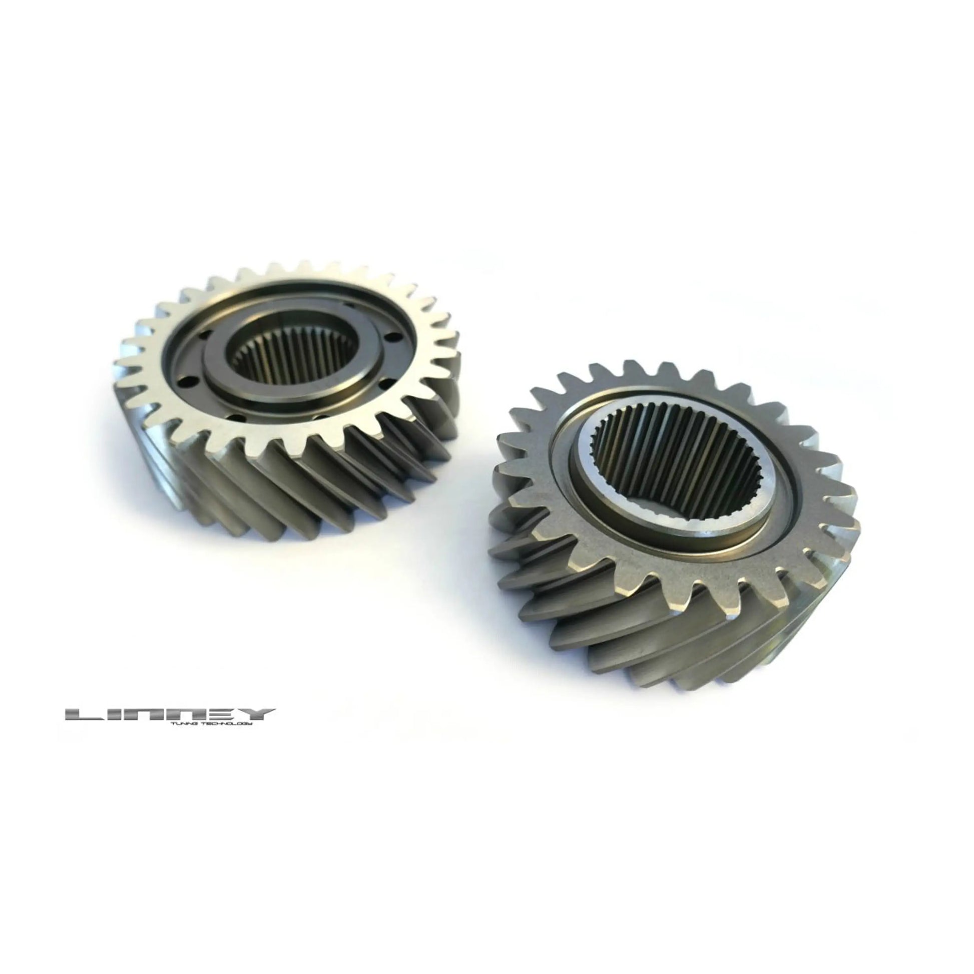Linney Heavy-Duty Rear Transfer Drop Gears are a vital upgrade for the Nissan GT-R R35. Engineered from high-alloy steel, these gears provide a massive strength increase to handle extreme horsepower and torque. Their precision design ensures reliable performance, reduces noise, and protects your GR6 transmission. Upgrade your GT-R's drivetrain for ultimate durability and peace of mind.